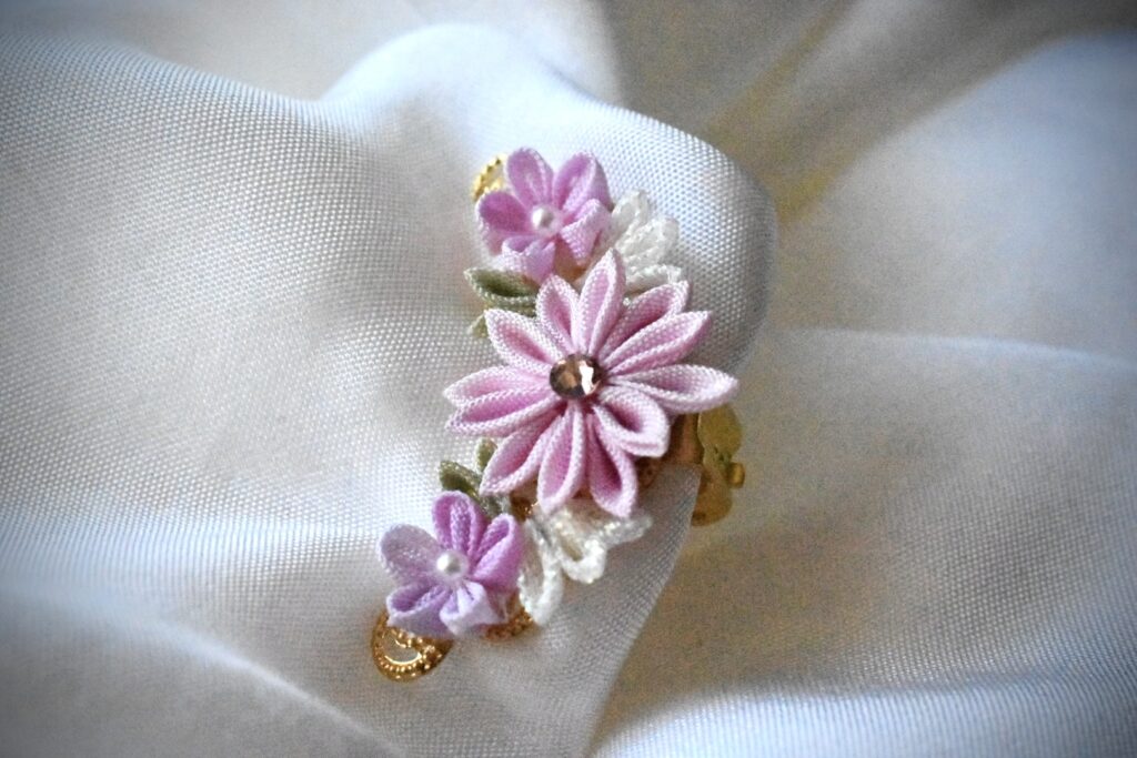 絹を使ったつまみ細工のアクセサリーを制作しています。1㎝角の小さな生地から一花づつ咲かせる緻密な手仕事です。絹ならではの気品のある光沢と、軽やかで小さくも上質な彩を添えるアクセサリーをお届けします。