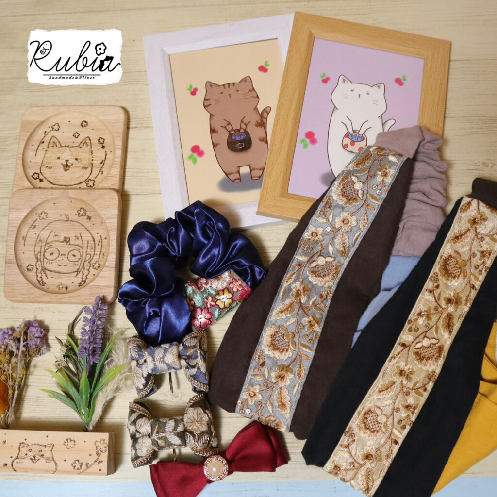 インド刺繍リボンを使った作品からオリジナルイラスト作品まで色々ございます!ぜひぜひお手に取ってご覧下さい!元気よく皆様のご来場お待ちしております!